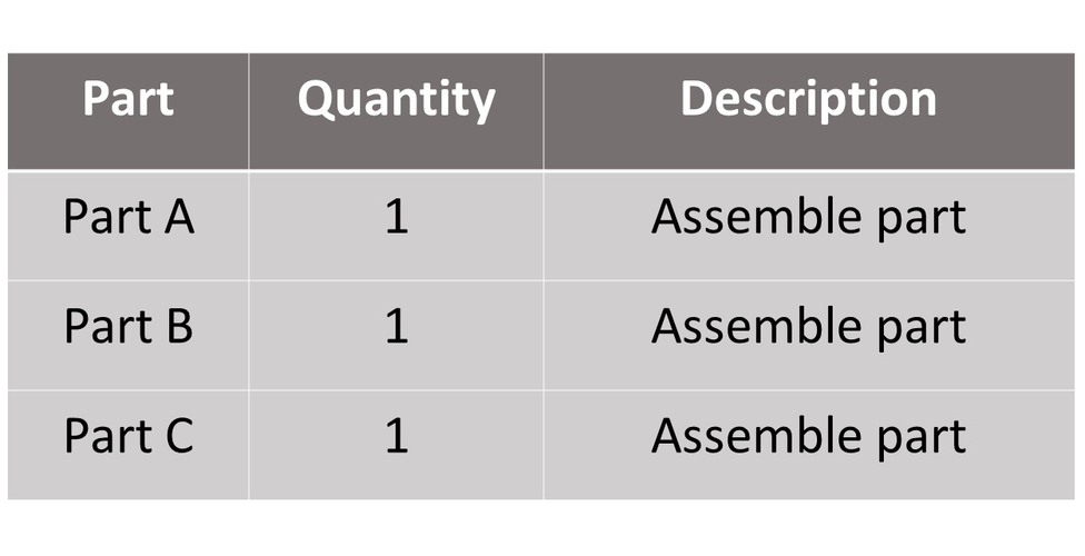 Ett exempel på en tabell som bara presenterar produktinformation.
