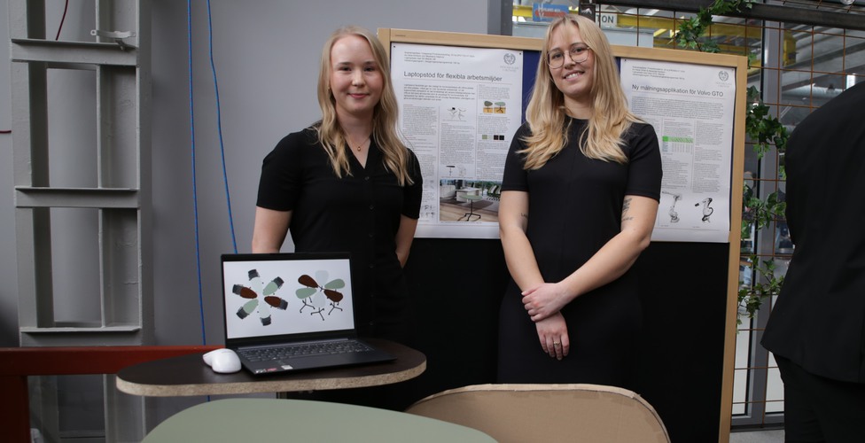 Alice Kihlbom och Madelene Siljehult hade designat ett laptopstöd för flexibla arbetsmiljöer tillsammans med SA Möbler i Tibro.