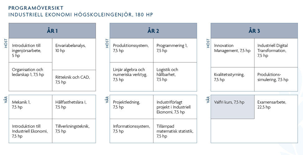 Första året lär du dig grunderna som behövs för att kunna arbeta som en framtida ingenjör. Du lär dig förstå industriella processer och hur teknik och ekonomi samverkar i organisationers vardag. I kursen Materiallära och tillverkningsteknik samarbetar du med studenter från andra program i ett praktiskt projekt. Du får prova på verkliga ingenjörsuppgifter och se hur olika kompetenser bidrar till att lösa tekniska utmaningar.